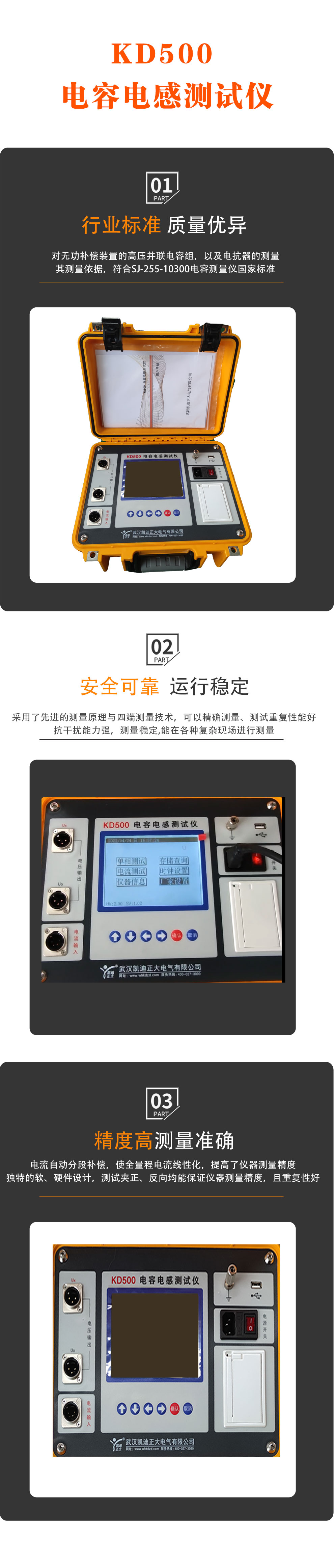 KD-500智能電容電感測試儀要是對無功補償裝置的高壓并聯電容組,以及電抗器的測量,其測量依據,符合SJ-255-10300電容測量儀國家標準。針對變電站現場高壓并聯電容器組測量時存在的問題而專門研制。