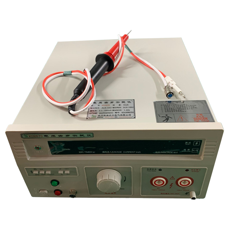 KD2670A電壓擊穿測試儀根據其作用可稱為電氣絕緣強度試驗儀、介質強度測試儀等。其工作原理是:把一個高于正常工作的電壓加在被測設備的絕緣體上,持續一段規定的時間,加在上面的電壓就只會產生很小的漏電流,則絕緣性較好。程控電源模塊、信號采集調理模塊和計算機控制系統三個模塊組成測試系統。選擇耐壓儀的2個指標:最大輸出電壓值及最大報警電流值的數值。