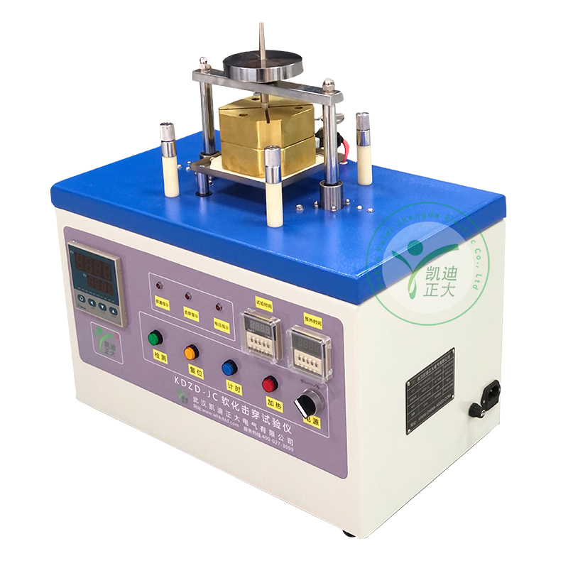 KDZD-JC軟化擊穿試驗儀用于檢測3.00mm及以下漆包線在熱狀態下漆膜軟化后的絕緣性能,根據設定的預熱溫度、試驗時間、儀器自動完成對試樣的預加熱、加負荷、加試驗電壓,達到試驗時間或試樣被擊穿時即卸負荷,發出聲光信號。該儀器采用熱電偶測溫,智能溫度控制,能自動調節和顯示試驗溫度、測試部分采用集成電路,整個測試過程自動完成。