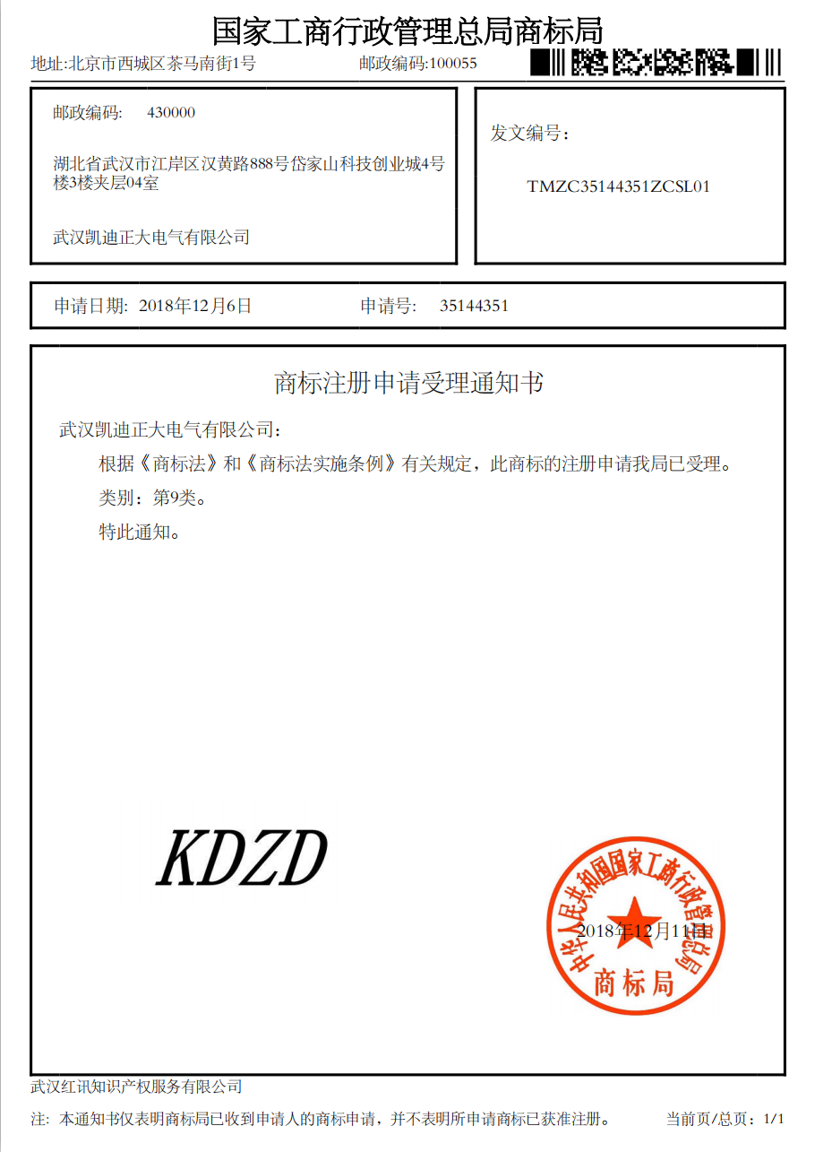 ![]() “凱迪正大”國家工商行政總局商標局受理書 |