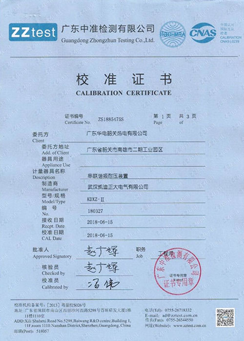 武漢凱迪正大KDXZ--II串聯諧振耐壓試驗裝置校準證書