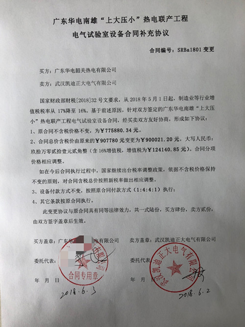 國家財政部財稅[2018]32號文要求,從2018年5月1日起,制造業(yè)等行業(yè)增值稅稅率從17%降至16%。基于前述原因,針對雙方簽定的廣東華電南雄“上大壓小”熱電聯(lián)產工程電氣試驗室設備合同,經買賣雙方友好協(xié)商,形成如下協(xié)議: