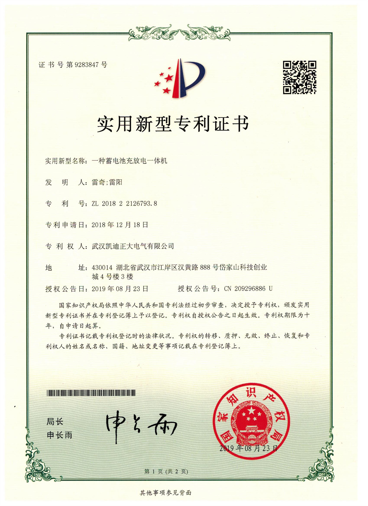 KDZD886蓄電池充放電一體機(jī)專利,一種用于蓄電池充放電一體機(jī),證書(shū)號(hào)第:9283847號(hào)。專利號(hào):ZL 2018 2 2126738.8 專利權(quán)人:武漢凱迪正大電氣有限公司