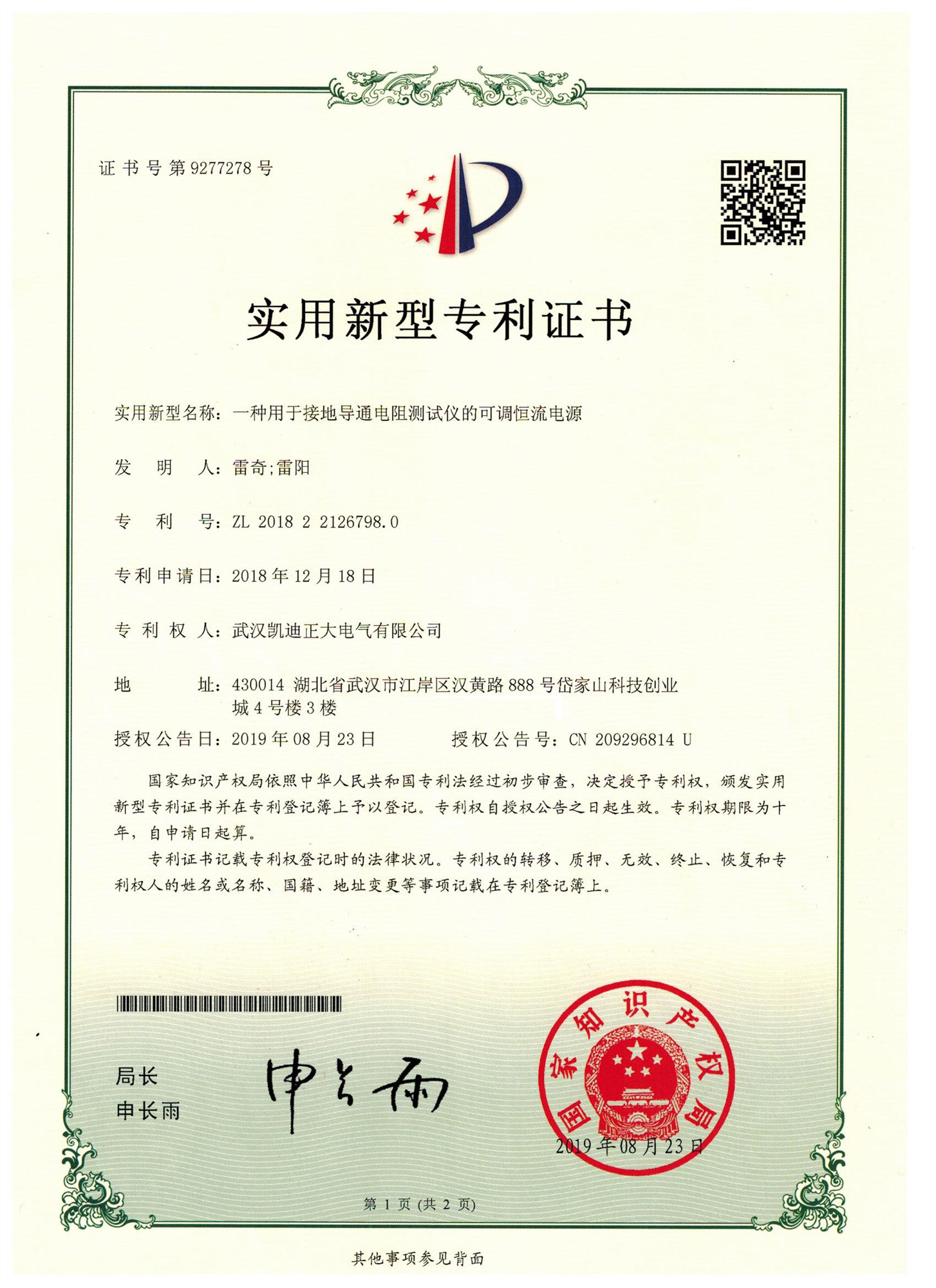 KDDT-10A接地引下線導(dǎo)通測(cè)試儀專利,一種用于接地導(dǎo)通電阻測(cè)試儀的可調(diào)恒流電源,證書(shū)號(hào)第:9277278號(hào)。專利號(hào):ZL 2018 2 2126798.0 專利權(quán)人:武漢凱迪正大電氣有限公司