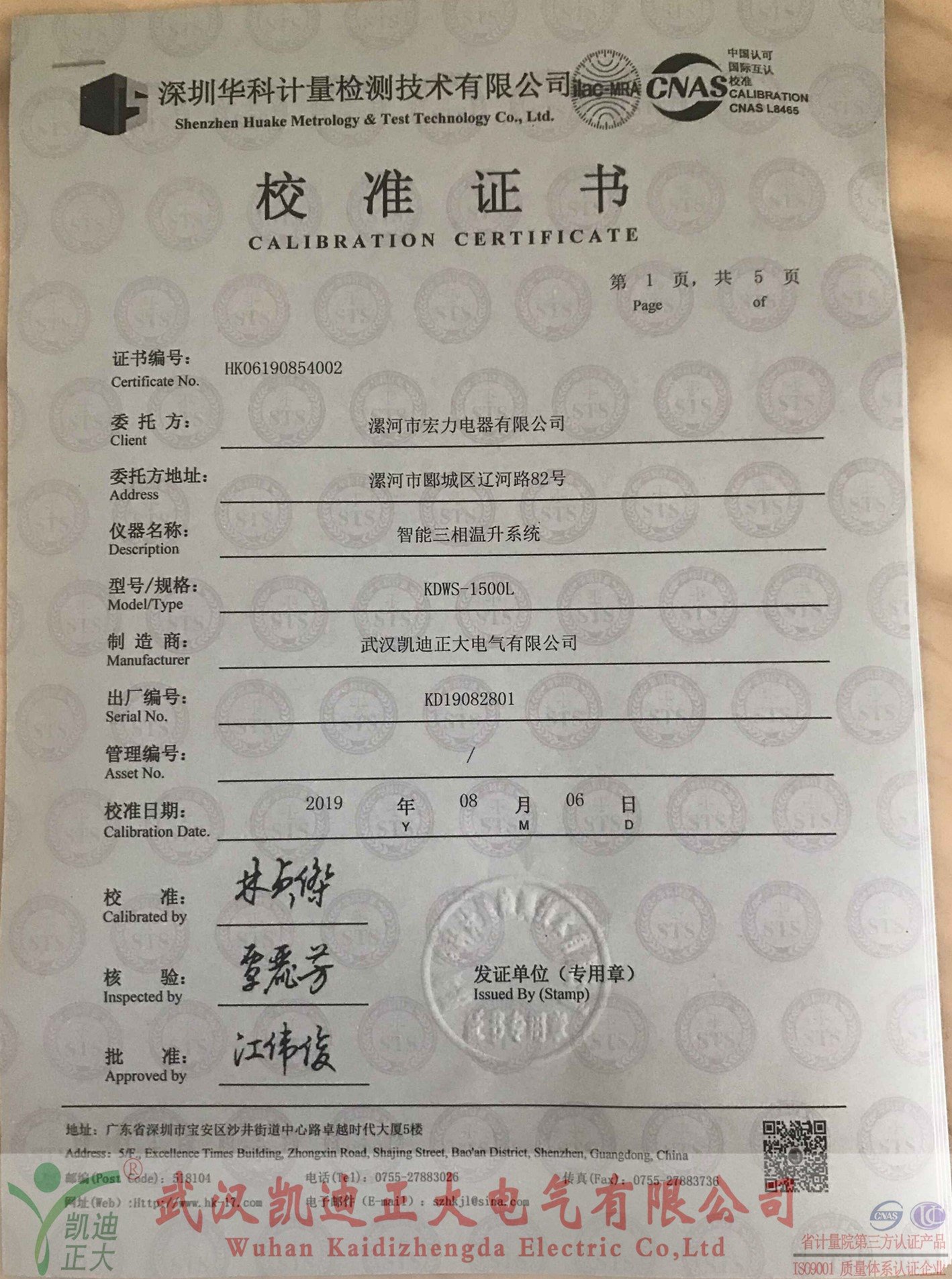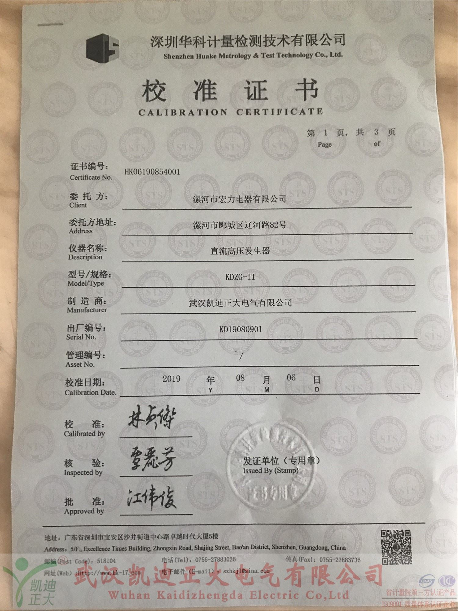 漯河宏力電器采購(gòu)我司設(shè)備獲得深圳華科計(jì)量證書