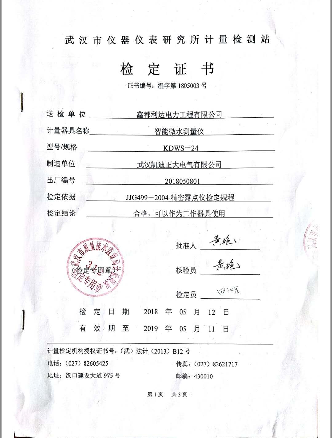 武漢市儀器儀表研究所計(jì)量檢測(cè)站,計(jì)量檢定機(jī)構(gòu)授權(quán)證書:(武)法計(jì)(2013)B12號(hào)。武漢凱迪正大電氣有限公司生產(chǎn)的KDWS-24智能微水測(cè)量?jī)x,出廠編號(hào)2018050801,符合檢定依據(jù)JJG499-2004精密露點(diǎn)儀檢定規(guī)程,可以作為工作器具使用。獲得武漢市儀表研究院計(jì)量站檢定證書,證書編號(hào):濕字第1805003號(hào)。