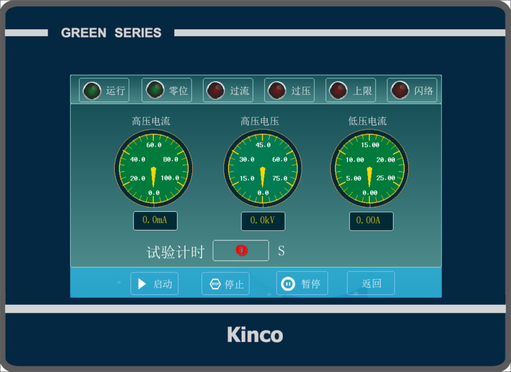 試驗(yàn)狀態(tài):高壓擊穿設(shè)備安全說明,軟件里實(shí)時顯示當(dāng)前試驗(yàn)狀態(tài),如:試驗(yàn)門是否關(guān)閉,升壓指示、歸零復(fù)位指示等。
