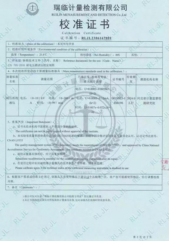 參照J(rèn)JG 795-2016 耐電壓測(cè)試儀檢定規(guī)程檢定要求,KDYD2675 工頻高壓測(cè)試臺(tái)獲得證書(shū)RLJL2306167001檢定證書(shū)。