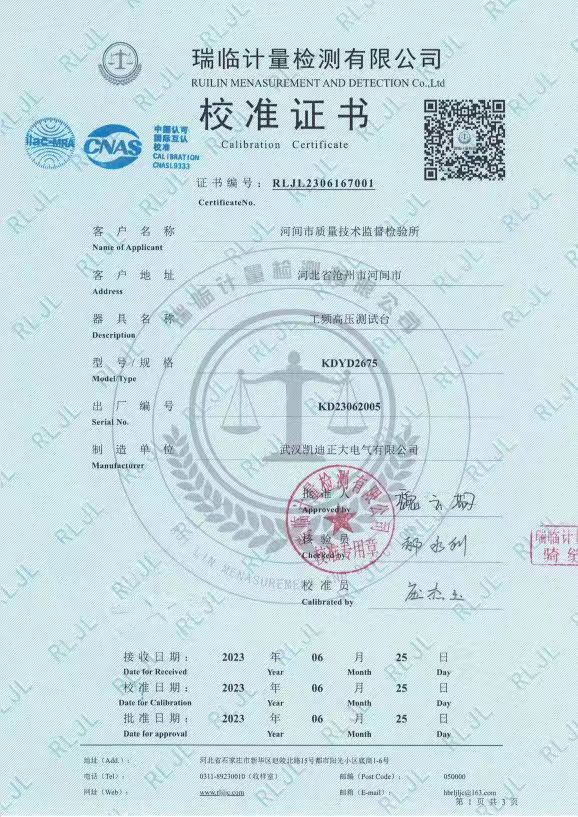 河間市質(zhì)量技術(shù)監(jiān)督檢驗(yàn)所采購(gòu)我司KDYD2675 工頻高壓測(cè)試臺(tái),應(yīng)技術(shù)要求送第三方檢測(cè)機(jī)構(gòu)瑞臨計(jì)量檢測(cè)有限公司檢定。