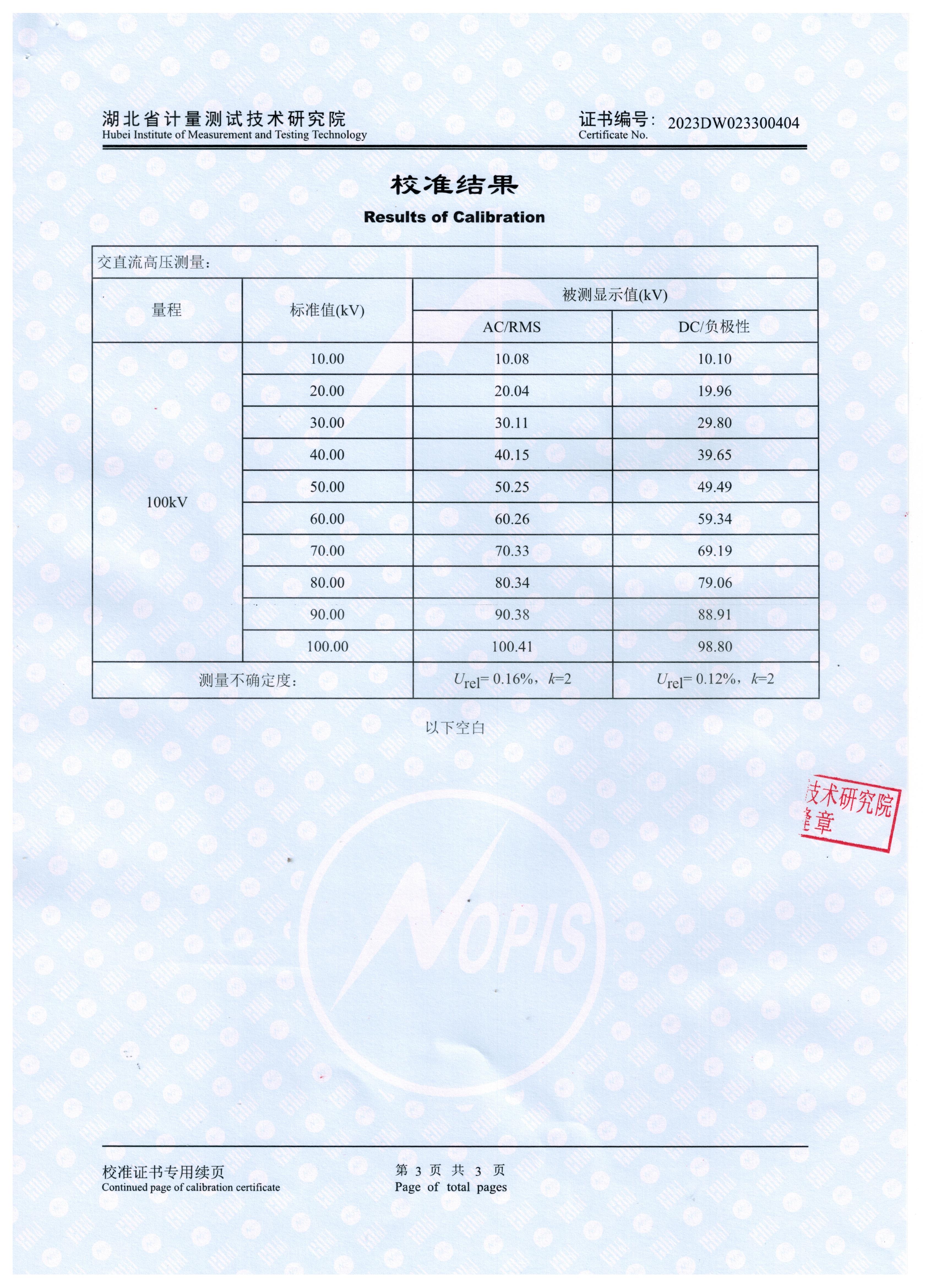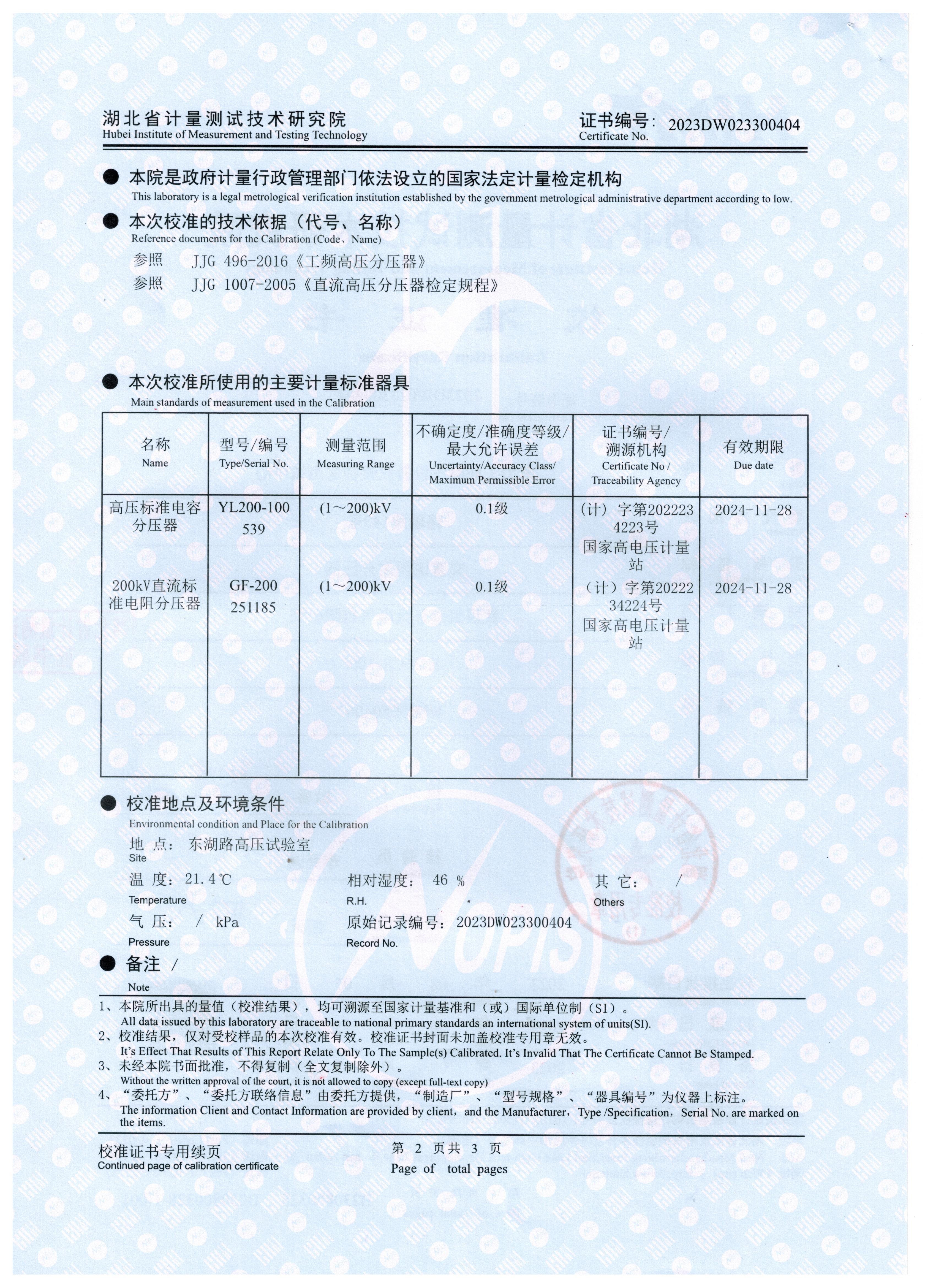 參照  JJG 496-2016 《工頻高壓分壓器》、JJG 1007-2005《直流高壓分壓器鑒定規程》 檢定要求,KDFCR-100 交直流兩用分壓器獲得證書2023DW023300404檢定證書。