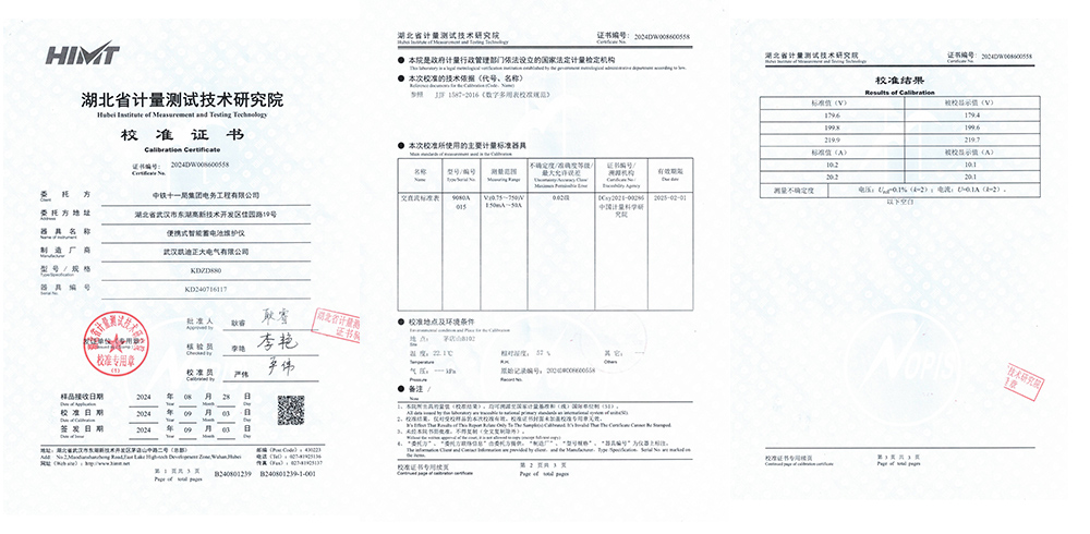 KDZD880便攜式智能蓄電池維護儀在交付前,順利通過了湖北省計量測試技術研究院的嚴格檢測。此次檢測嚴格遵循JJF 1587-2016《數字多用表校準規范》,對設備的測量精度、穩定性、安全性等關鍵指標進行了全面評估。結果顯示KDZD880的各項性能指標均達到標準要求,為用戶的信賴與選擇提供了堅實的數據支撐。