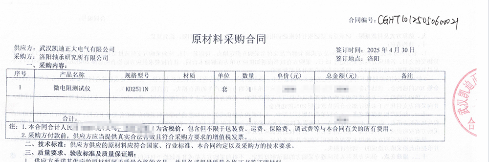 洛陽(yáng)軸承研究所有限公司對(duì)設(shè)備的選擇秉持著高標(biāo)準(zhǔn)、嚴(yán)要求的原則。在決定采購(gòu)KD2511N微電阻測(cè)試儀前,該公司進(jìn)行了詳盡的市場(chǎng)調(diào)研與產(chǎn)品對(duì)比。武漢凱迪正大以其專業(yè)的技術(shù)團(tuán)隊(duì)、完善的售后服務(wù)以及眾多成功案例,贏得了客戶的信賴。