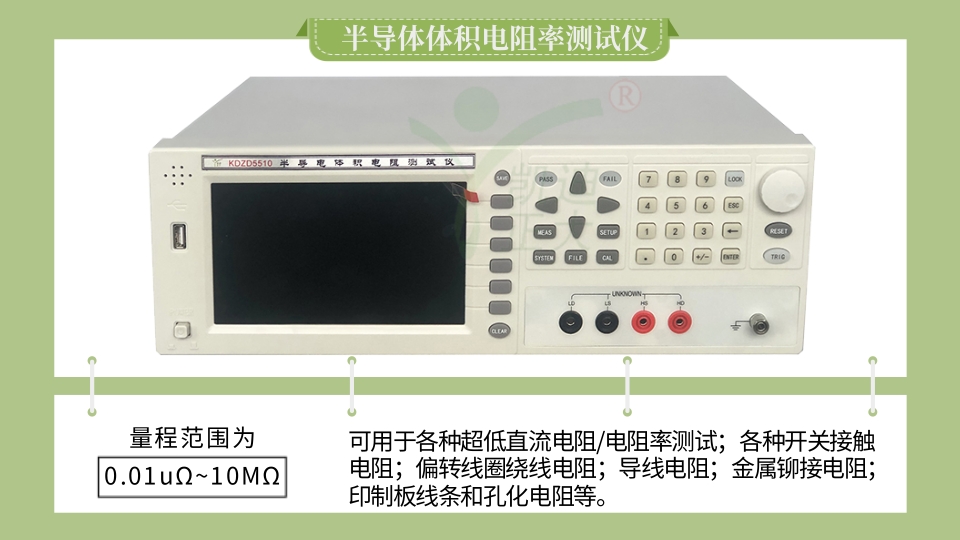 KDZD5510半導體體積電阻率測試儀可用于電線電纜、分流器、金屬、導體等各種超低直流電阻/電阻率測試。也可測量各種開關接觸電阻;接插件接觸電阻;繼電器線包和觸點電阻;變壓器、電感器、電機、偏轉線圈繞線電阻(感性負載請選用單向電流模式測試);導線電阻;車、船、飛機的金屬鉚接電阻;印制板線條和孔化電阻等。