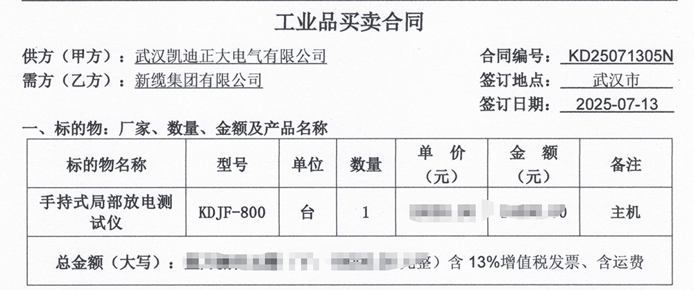 2025年7月13日,電力設備制造商新纜集團有限公司采購了武漢凱迪正大電氣有限公司的KDJF-800局部放電檢測儀,這彰顯了武漢凱迪正大在局部放電檢測領域的專業實力和市場地位。