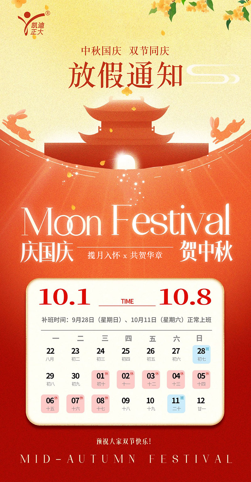 凱迪正大電氣2025年國慶中秋放假通知: 根據(jù)國家法定節(jié)假日安排,結(jié)合公司實際情況,現(xiàn)將2025年國慶節(jié)、中秋節(jié)放假事宜通知如下: